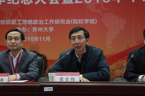 1125日上午,中国纺织职工思想政治工作研究会(院校学组)成立三十周年纪念大会暨2016年年会在苏州大学举行。中国纺织服装教育学会会长倪阳生,我校党委书记张宏伟,研究会原会长、北京服装学院原党委副书记杨绍文,研究会现任会长、北京服装学院党委副书记倪赛力,苏州大学党委副书记、副校长江作军出席开幕式,来自东华大学、北京服装学院、c7网页版、浙江理工大学、苏州大学等纺织高校分管思想政治工作的校领导及宣传部、学工部、团委负责人和政治理论课骨干教师60余名代表参加会议。