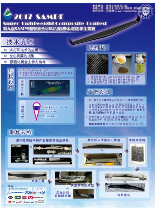 2017年5月10-12日,由中国航空学会、SAMPE中国大陆总会共同主办,美国波音公司、中航复合材料有限责任公司赞助支持的第九届SAMPE超轻复合材料机翼/桥梁竞赛在北京举行。在本次竞赛中,我校材料学院复合材料专业的学生们与来自国内知名航空、航天院校的138支学生团队同台竞技,获得2个竞赛三等奖,1个海报一等奖,1个海报三等奖。