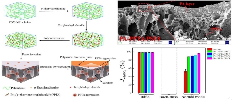 薄层复合膜已广泛应用在海水淡化、污水处理等领域。但是,传统的薄层复合膜依然存在两点不足,即如何进一步提高功能层与基膜的结合强度和基膜的耐压密性,从而提高膜分离效率,延长使用寿命。张宇峰教授团队从分子设计角度提出利用刚性高分子PPTA的高强度和具有酰胺结构和端-NH2的结构特性,以同时提高聚酰胺复合膜基膜耐压密性和聚酰胺功能层与基膜的结合强度为出发点,通过原位共混法制备出PPTA(聚对苯二甲酰对苯二胺)/PSf共混基膜后,再进行界面聚合制备出聚酰胺复合膜。发现在基膜通量得到明显提高的同时,其耐压密性也得到改善,功能层与基膜的结合强度得到明显提高,在0.5MPa,纯水反压30min后,以PPTA/PSf 为基膜的复合膜依然能够对1 g/L MgSO4保持96%以上的截留率。该研究从分子设计的角度提高功能层与基膜的结合牢度和基膜耐压性,为制备高稳定性聚酰胺复合膜提供了新思路。