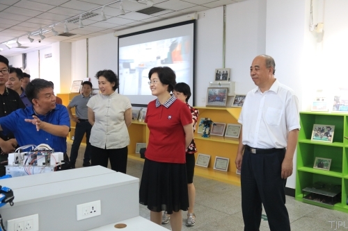 在大学生创新创业实践基地,程丽华书记一行实地考察了学校智慧教室、创新创业实验室,观看了近年来我校大学生学科竞赛、创新性研究成果,学生研发的可以对话的机器人、教学型绳带编织机、慧鱼机械创新设计、基于PLCPIZZA自动化配料系统设计、动画专业毕业影展作品等吸引了程丽华书记一行的驻足。她详细了解了学生的创新创业情况,对我校作为天津市唯一地方院校入选全国深化创新创业教育改革示范高校表示充分肯定。在调研中,程丽华书记一行查看了工程教学实习训练中心直属党支部的党员活动室,查阅了党建材料,了解基层党建情况。