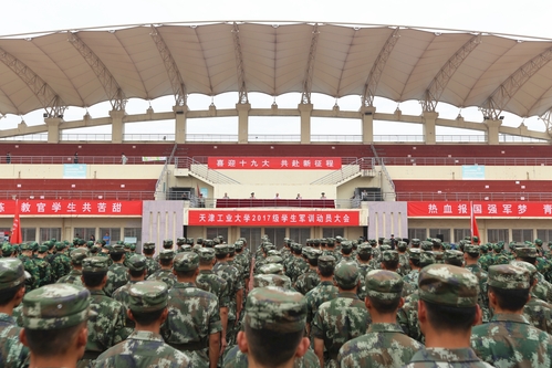 9月15日上午,我校2017级军训动员大会在望星体育场举行。承训部队领导武警天津市总队滨海新区支队一大队政治教导员蒋林林同志,一大队副大队长李文广同志,校党委副书记、校长杨庆新同志,校党委副书记刘亚男同志出席了动员大会。大会由学生工作部副部长张录全同志主持。