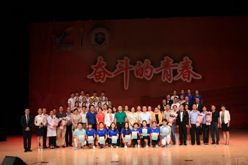 表彰会上,刚刚载誉归来的我校健美操队在受聘为本次全运会导演的欧阳珊珊老师带领下,献上了动感十足的健美操表演,再一次让全场志愿者感受奋斗,感受青春。由辅导员老师和学生志愿者为大家带来的原创诗朗诵《在全运会的旗帜上写下奉献》更是掀起了现场高潮,梦圆全运,无私奉献,工大人的光荣与梦想留在心中。情景剧《2017·这个暑假》,给志愿者简述了文体展演预备队队员的感人故事。全运背后有默默奉献着的老师和工作人员,志愿者代表向幕后工作者代表献花,也献上了志愿者的一声声感谢。