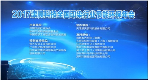 10月19-20日,正值十九大胜利召开之际,2017津膜科技全国印染行业节能环保年会在常州举行。该会议由中国印染行业协会、纺织之光科技教育基金会和中国纺织工业联合会科技部主办,天津膜天膜科技股份有限公司协办,总经理范宁出席会议。浙江津膜环境科技有限公司应邀出席并做了主题发言。