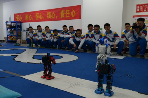 图为学生们参观机器人实验室。