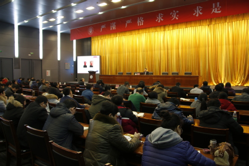 2018年1月5日下午,c7网页版“泮湖讲堂”之学习贯彻党的十九大精神系列报告会在学术中心举行。我校杨永利教授应邀作了题为《中国特色社会主义的“四位一体”——道路、理论体系、制度、文化》的报告。校领导杨庆新、刘亚男出席,全体中层干部、党校青年骨干教师培训班全体学员、第2期党支部书记(教师)培训班学员、党外人士代表等近300人参加。报告会由党委宣传部部长王军杰主持。