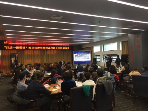 本次培训采取工作坊的形式,内容涵盖慕课、翻转课堂、混合式教学设计与实现、精品在线开放课程的教学设计、微课视频设计与实现等。上海交通大学慕课研究院余建波老师应邀担任主讲。授课中,余老师将慕课设计理念与实践相结合,带领大家体验在线开放课程设计的全过程,进一步加深了参训教师对混合式教学模式的认识,使大家掌握了更多的教学理念与方法。