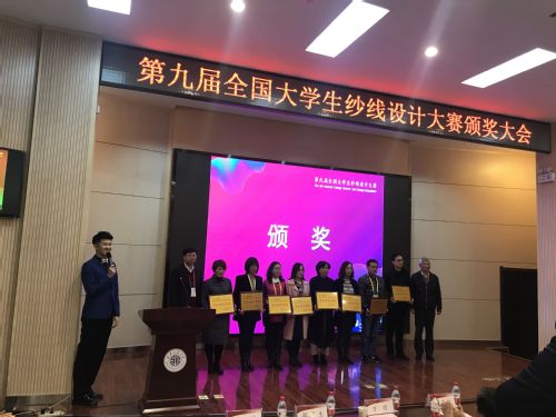 2018年11月17日,第九届全国大学生纱线设计大赛颁奖大会在西安工程大学隆重举行。经过激烈角逐,我校获得一等奖4项、二等奖4项、三等奖8项。同时,我校获得“最佳组织单位奖”,赵立环、周宝明两位老师获得“优秀指导教师奖”。我校学生徐沈阳作为4名参赛学生代表之一,参加了颁奖礼并作报告,分享了作品创作过程和参赛感受。