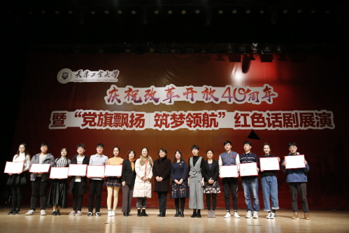 12月6日,我校庆祝改革开放四十周年暨“党旗飘扬 筑梦领航”红色话剧展演在艺缘礼堂举行。天津音乐学院及我校党委组织部、党委宣传部、工会、机关分党委相关老师担任展演评委,师生近800人观看了展演。本次活动由党委组织部和党委学生工作部主办。