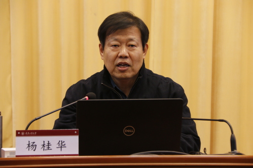 2018年12月14日下午,我校顾问教授杨桂华教授做客泮湖讲堂,在学术中心作了题为《建设强大的社会主义意识形态》的报告,这也是我校党委理论学习中心组学习的扩大会议。报告会前,校长夏长亮会见了杨桂华教授。校党委副书记刘亚男、副校长赵宏出席,全体中层干部、党校(社会主义学院)学员近300人聆听了报告。报告会由校党委副书记刘亚男主持。