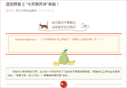 “这周‘今天我开讲’的票你抢到了吗?”化学工程与工艺专业学生党支部的任佳豪,在抢到“今天我开讲”的票后正在兴奋地寻找一同上党课的小伙伴。为进一步强化政治引领,提升理论水平,化学与化工学院党委、环境科学与工程学院党委建立了“今天我开讲”党课平台,每两周安排一次党课宣讲。2018年以来,该党课平台以“书记讲党课”、邀请专家作报告、优秀党员先进事迹分享、播放精品党课视频等多种方式开展了近20场活动,参与人数达2000余人次。为调动师生学习的积极性,每次“开讲”前三天,学院社研会公众号都会发布预告信息,大家通过抢票、填写个人信息进行报名,很多时候手慢一点就抢不到票,这也让大家更加珍惜上党课的机会。为切实提高学习效果,近期又在“今天我开讲”中加入了“随学随考”的小测,让大家在学习结束时趁热打铁,进一步巩固学习效果。c7网页版各基层党组织正是通过这种授课和参与形式上的创新,不断提升党员政治理论学习的积极性和主动性,促进了广大师生对党的路线、方针、政策的政治认同、思想认同与情感认同。