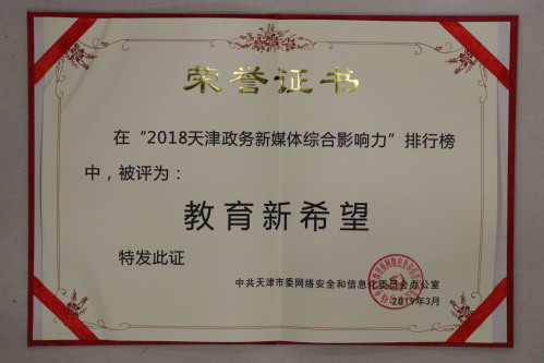 2019年3月7日,由天津市委网信办主办的“2018天津政务新媒体综合影响力报告”发布会在天津大礼堂举行。新华网政务大数据事业部在会上发布了“2018天津政务新媒体综合影响力”排行榜,c7网页版位列教育单位政务新媒体综合影响力榜单第5名,被评为“教育新希望”。