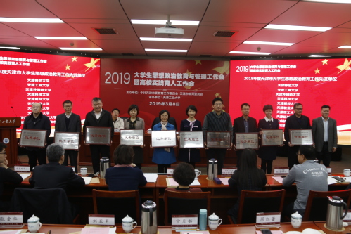工作会上,首先对天津市高校“新时代·实践行”系列实践活动先进团队标兵、先进个人标兵进行了表彰,我校包揽该活动五个项目的全部先进集体标兵和个人标兵。与此同时,我校以综合分数第二的成绩蝉联2018年天津市大学生思想政治教育工作先进单位,校党委副书记刘亚男代表学校接受优秀单位授牌。