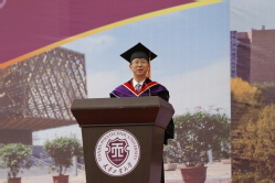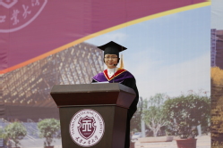 研究生导师肖强教授代表全体研究生指导教师致辞。他用四个“必须”表达了对学子们的嘱托:用社会主义核心价值观统领思想言行;知行合一,让思想和灵魂同时在路上;读万卷书,行万里路,阅无数人;用经纬人生的智慧,以天工开物的气魄,完成实实在在的事业。