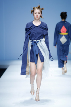 本次展出的设计作品根据合作企业北京绮瑞服装服饰有限公司的产品开发要求,以舒适型休闲装为设计目标,探讨设计对于人的意义。设计过程以产品研发的形式展开,以目标市场研发为基本点,解放和拓展学生的想象力和创造力,同时注重设计及产品市场营销策划能力培养,强调设计的社会价值,要求学生在设计创作的过程中努力平衡创新与实用、设计与市场价值之间的关系,不断寻找设计本源和市场需求的契合点。这也高度契合了大学生时装周所坚持的“以人才培养为基础、以设计创新为先导、以促进产学研结合为目标”的办展思想。