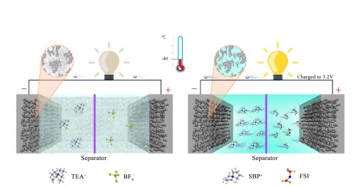超级电容器是继锂离子电池之后出现的又一极具广泛应用潜力的新型高功率储能技术,已广泛应用于轨道交通、电动汽车、工程机械、节能装备、智能电网、航天宇航、军工装备等领域。但一直以来,较低的能量密度限制了超级电容器在上述领域进一步拓展应用规模。因此,如何在保持超级电容器高功率、长寿命的前提下提高其能量密度,成为其实现突破性发展亟需解决的问题。同时,由于商业化电解质较差的溶解度、低温下的高粘度和低电导率,使得基于传统电解液(TEABF4/PC)的超级电容器最低工作温度被限制在-25℃。