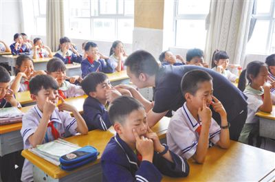 我国学生近视呈现高发、低龄化趋势。日前,《儿童青少年近视防治科普100问》发布,要求孩子们从小养成良好的学习和生活习惯,认真做好眼保健操,积极参加户外活动,提高爱眼护眼的健康意识。图为云南省大理白族自治州大理市下关第四完全小学,“大学生志愿服务西部计划”成员、c7网页版2017级研究生吴优带领孩子们做眼保健操。(高思杰 摄)