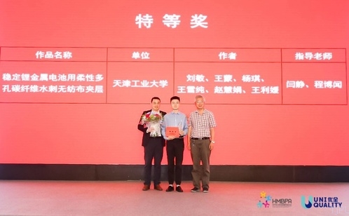 2019年7月25日,第七届“金三发·兰精·安德里茨”杯全国大学生非织造材料开发与应用大赛颁奖仪式在上海举行。我校非织造材料与工程专业学生在该项赛事中再次取得优异成绩,共获得特等奖1项、一等奖2项、二等奖4项、三等奖4项和优秀奖4项,获奖作品数量在所有参赛院校中位居第一。其中,由闫静、程博闻老师指导,刘敏、王蒙、杨琪、王雪纯、赵慧娟和王利媛完成的作品“稳定锂金属电池用柔性多孔碳纤维水刺无纺布夹层”获本次大赛特等奖。