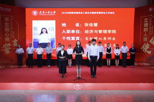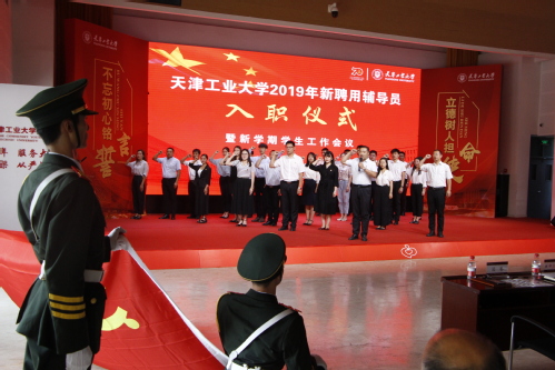 为进一步加强我校辅导员队伍建设,全面提升新聘用辅导员的职业认同感和归属感,9月6日下午,“不忘初心铭誓言 立德树人担使命”2019年新聘用辅导员入职仪式暨新学期学生工作会议在艺缘活动中心多功能厅举行。校党委副书记胡英江,天津市教委学生思想教育与管理处副处长杨明,党委办公室、组织部、宣传部、教师工作部、教务处、学生工作部、团委相关负责同志,各学院党委书记、副书记和全体辅导员参加了入职仪式。