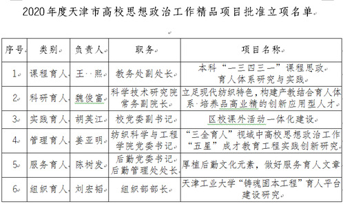 近日,天津市教育两委发布了2020年度天津市高校思想政治精品项目立项的公示名单,在批准立项的40项项目中,我校成功获批6项,居天津市高校前列。