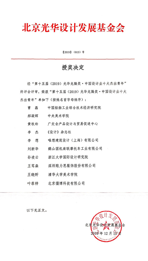 光华龙腾奖2005年在团中央支持下诞生,旨在“扶持设计人才成长,推动设计产业发展”,2011年获得国家奖励办批准,正式成为国家级奖项(国科奖社证字第0223号)。作为我国表彰设计人才唯一的国家级奖项,十五年间表彰了大批为我国设计产业发展做出杰出贡献的获奖者,共有150位青年精英获得“中国设计业十大杰出青年”荣誉称号,230位设计界代表人士获得“中国设计贡献奖”金质、银质奖章。据不完全统计,光华龙腾奖影响力涉及2000万设计从业者,带动社会经济价值数万亿元,是中国设计高速发展的重要见证。、