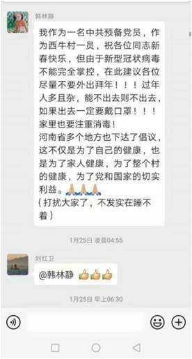 来自河北省保定市的韩林静,是经济与管理学院国贸专业一名大三学生。疫情发生后,她积极在张店镇西牛村党员微信群中宣传疫情防范知识,带头并号召大家云拜年、少聚集,并且坚持不信谣、不传谣,相信科学、增强信心,做好疫情防护。她积极响应村委会号召通过微公益和微信等各种渠道为湖北武汉捐款。她参与村内募捐,为村内的一线防控人员购买84消毒液和口罩等,为全力配合并帮助村委会做好疫情防控工作而行动着。她用自己的方式展现经管学子勇于担当、积极作为的良好精神风貌,用责任感和行动力诠释青春正能量。
