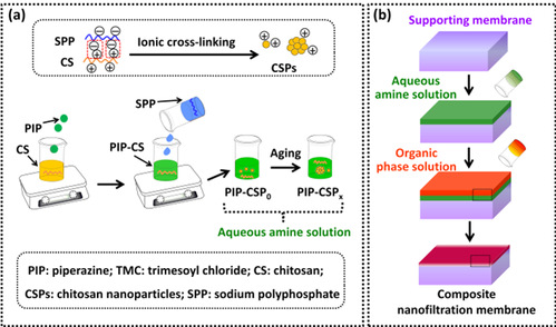 高渗透-选择性的纳滤膜能极大提高分离效率,降低能量消耗和降低投资成本,具有广阔的市场应用前景。然而,由于分离膜本身在渗透性和选择性之间存在trade-off效应,高渗透性和高选择性纳滤膜制备问题亟待突破。课题组通过向常规界面聚合的小分子水相单体溶液中添加可溶性壳聚糖大分子,利用水相溶液中各组分之间粘度差异和扩散速度差异,促使原位形成中间层并调控界面聚合过程,成功制得超薄(约20 nm)且致密PA分离层。该膜纯水通量达到226.1 L·m-2·h-1 ,是对照组PIP/TMC纳滤膜和商业纳滤膜通量的5倍,而截留率都在99.3%以上(Na2SO4)。研究工作将有利于推动纳滤膜在海水淡化、水质净化、小分子药物分离与纯化等领域的应用。