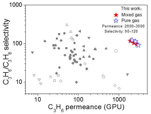 目前,MOF超薄膜主要在无机或金属支撑体上制备,限制了其工业应用。本工作提出了一种在有机高分子支撑体上,通过界面诱导制备MOF超薄膜的方法,可以原位生成厚度在45 到 150 nm的MOF超薄膜。由于界面层的极化诱导作用,本工作发现了一种新的MOF膜状态,即,“低晶态MOF膜”(LC-MOF membrane)。其由于具有丰富的金属空位,对烯烃/烷烃等分离十分有效。本工作制备的DZIF-8 LC-MOF低晶态超薄膜表现出目前最优的丙烯/丙烷分离性能(选择性:90~120;通量:2000~3000 GPU)。
