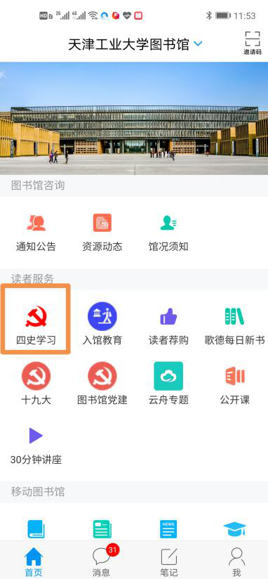 按照提示绑定本人学号或工号,单位为c7网页版图书馆账号。c7(中国)点击右上角“邀请码”输入“tjgydxtsg”,进入学校图书馆主页面,然后在主页面点击“四史学习”模块进入学习页面。