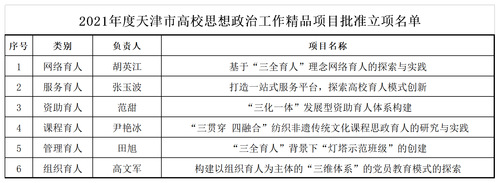 近日,市委教育工委市教委公布了2020年度天津市高校思想政治工作精品项目结项及2021年度天津市高校思想政治工作精品项目立项名单。我校承担的2020年度6个项目顺利结项,其中校党委副书记胡英江主持的《区校课外活动一体化建设》和党委常委、党委组织部部长刘宏韬主持的《c7网页版“铸魂固本工程”育人平台建设研究》2个项目获得优秀,其他4个项目为合格。在2021年批准立项的40项项目中,我校成功获批6项,居天津市高校前列。