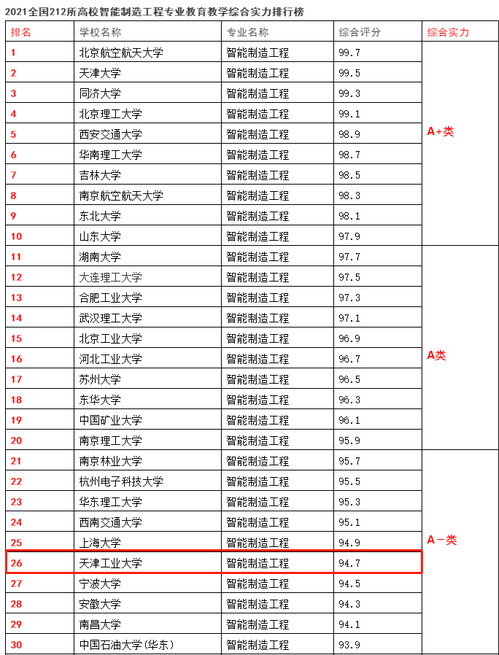 近日,在全国高校人工智能与大数据创新联盟公布的2021全国212所高校智能制造工程教育教学综合实力排行榜中,我校智能制造工程专业跻身A类行列,排名第26名。