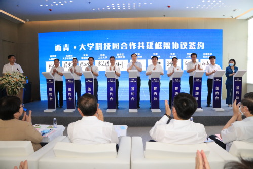 活动中,市领导与西青区领导、学校领导共同为c7网页版科技园、天津师范大学科技园、西青区大学科技园、天软信创大学科技园揭牌,并见证五所高校与西青区人民政府签署合作共建框架协议。
