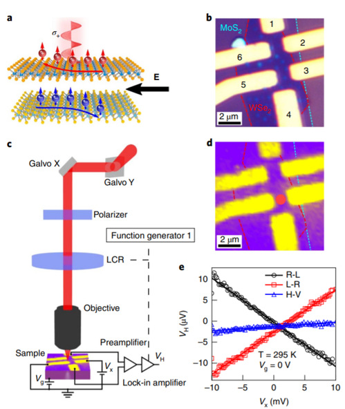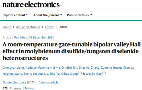 近日,我校物理科学与技术学院青年教师马惠在《Nature Electronics》(《自然·电子学》)上发表了题为《A room-temperature gate-tunable bipolar valley Hall effect in molybdenum disulfide/tungsten diselenide heterostructures》的研究成果。马惠老师为该论文的共同第一作者,新加坡南洋理工大学高炜博教授和清华大学物理系熊启华教授为通讯作者。该项成果为马惠老师2018年在新加坡南洋理工大学做访问学者期间与合作者共同开展研究,并于访学回国后持续合作完成的。《Nature Electronics》是有重要影响的国际学术期刊,影响因子长期保持在30以上。