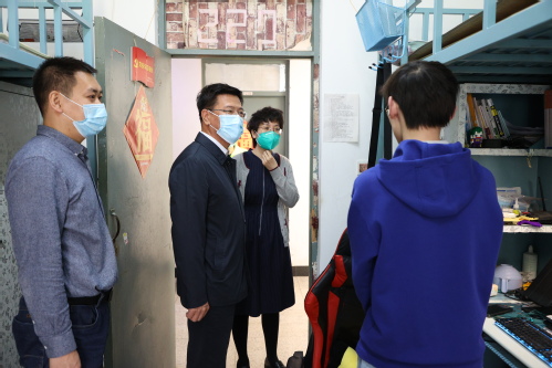 随后,胡英江副书记一行来到学生公寓,检查指导学生公寓疫情防控和安全管理等工作。胡英江副书记强调,学生公寓要严格落实落细疫情防控各项要求,压紧压实各项安全责任,为住校学生提供安全健康的生活环境。胡英江副书记还走进学生宿舍,详细询问住校学生近期的生活学习状况,认真听取大家的想法和意见,鼓励同学们居校安心学习,做好自我防护,在抗疫中成长,在磨砺中奋楫。