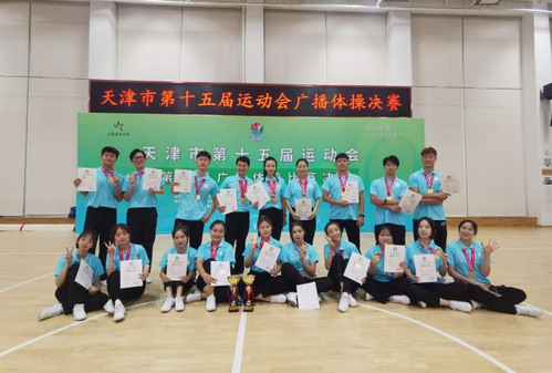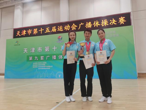 我校高度重视四年一次的天津市运动会,派出强劲阵容代表队参赛。代表队由体育工作部党总支书记王丽焕担任领队,周校锋、欧阳珊珊两位教师兼任教练员,队员由周校峰、欧阳珊珊、杨静三名教师和左卓、马章浩、秦启航、段浩、张哲、魏语聪、赵如玉、刘雨蒙、谢静泽、郭霆宇、王晓妍、周杰、王林、胡可、姜启航、吴杰涛十六名学生组成。在参赛队员中,既有国家级高水平运动员,也有初次参加比赛的普通学生。虽然大家的专业基础不同,但是师生团结一致、互相帮助、齐心协力、共同进步。在教练科学有效的指导和带领下,经过长达三个月的刻苦训练,同学们的技术水平得到快速提升,团体凝聚力和荣誉感也不断增强。比赛中,大家热情高涨,全情投入,默契配合,圆满完赛。经过激烈的角逐,周校锋、欧阳珊珊和杨静三位教师组成的团队以全场最高成绩9.20分获得了广播体操三人(甲组)项目的第一名;十六名学生和三位教师组成的团队以全场最高成绩9.0分获得了广播体操团体(甲乙组)项目的第一名。