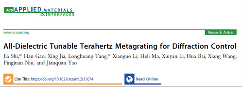 近日,我校电子与信息工程学院副教授石嘉在TOP期刊《ACS Applied Materials & Interfaces》(影响因子10.383)发表了题为《All-Dielectric Tunable Terahertz Metagrating for Diffraction Control》的研究成果,并被选为Supplementary Cover。石嘉副教授为该论文的第一作者和共同通讯作者,该成果由c7网页版、中国工程物理研究院流体物理研究所、天津大学共同完成。论文链接:https://pubs.acs.org/doi/10.1021/acsami.2c13674