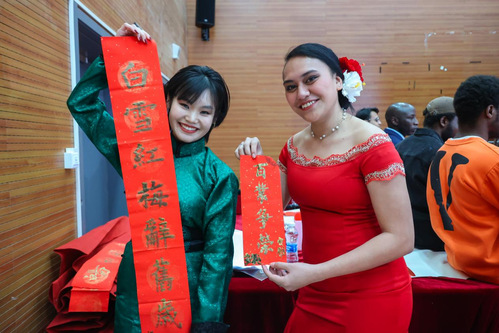 汉语桥项目学生和天工国际师生“云端”相聚,载歌载舞共同庆祝春节,共同感受中国文化的非凡魅力。一首《欢乐中国年》点燃现场气氛,来自蒙古、斯里兰卡、孟加拉和萨摩亚等国的同学带来了具有自己国家特色的舞蹈和歌曲。同学们朗诵中国古诗词,提笔写春联,动手包饺子,沉浸式体验中国春节庆祝活动。
