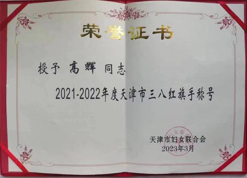 近日,天津市妇女联合会正式发文表彰2021-2022年度天津市三八红旗手标兵和天津市三八红旗手(集体),我校工学部副主任高辉教授被授予天津市三八红旗手荣誉称号。
