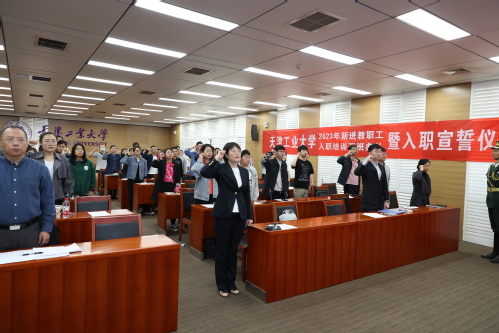 10月17日上午,我校2023年新进教职工入职培训开班典礼暨入职宣誓仪式在第七会议室举行。校党委书记沈江、党委副书记陈泮成、常务副校长姜勇出席会议,党委教师工作部(教师发展中心)、人事处主要负责同志和新入职的70余名教职工参加。会议由陈泮成副书记主持。