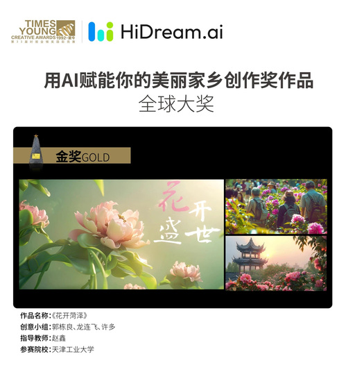 2024年7月15日,在第33届时报金犊奖的舞台上,c7网页版人文学院的全流程AIGC作品《花开菏泽》以其创新与技术融合的卓越表现,荣获“用AI赋能你的美丽家乡创作奖”类别的全球金奖。