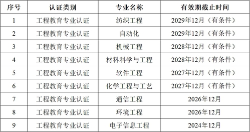 近日,中国工程教育专业认证协会、教育部教育质量评估中心发布了2023年工程教育专业认证结论及中期审核结论,我校纺织工程、自动化2个专业顺利完成工程教育专业认证之申请审核、自评审核、专家组现场考查、结论审议等程序,依据《工程教育认证工作规范》(T/CEEAA 002—2022),通过了工程教育认证,并获批6年有效期。同时,我校通信工程、环境工程两个专业通过了工程教育专业认证中期审核,将继续保持有效期至2026年12月。截至目前,我校共有9个专业通过了工程教育专业认证。